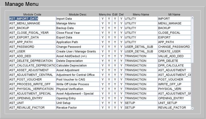 This form is used to manage the menu and its grants to user. This form is only available to Admin level users.