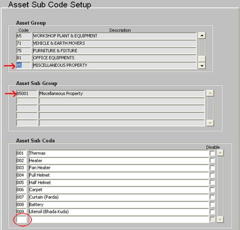 9 Asset Sub Code Detail: This menu consists of six more sub menus.
