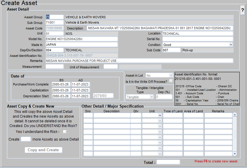 6. All the detail of Asset are posted in the related fields except Asset Location, Department Code and Sub Code.