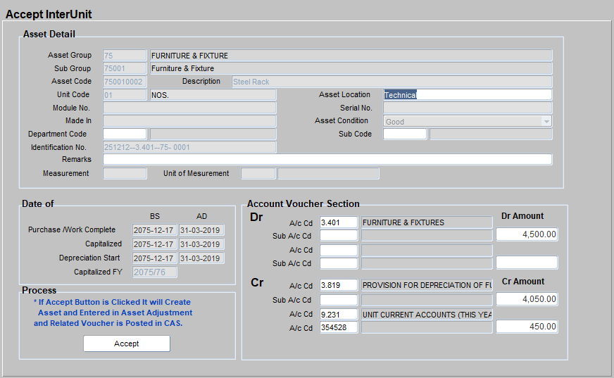 5. If "Yes" option is selected the new "Accept InterUnit" form is displayed.